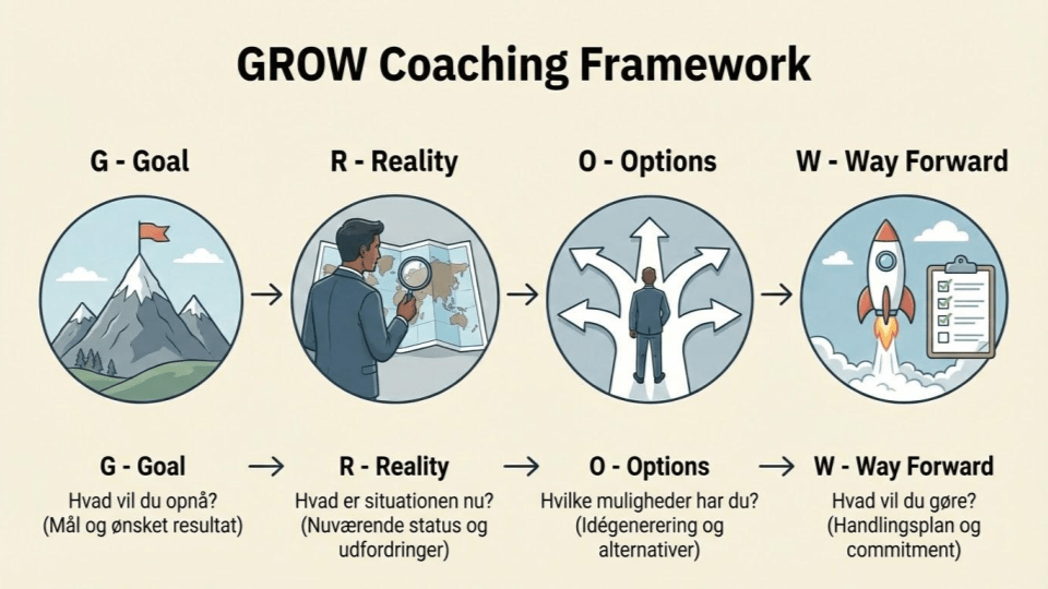 ChiefCoach.org anvender det anerkendte GROW-coaching rammeværket. GROW er et akronym for: Goal, Reality, Options and Way (forward).